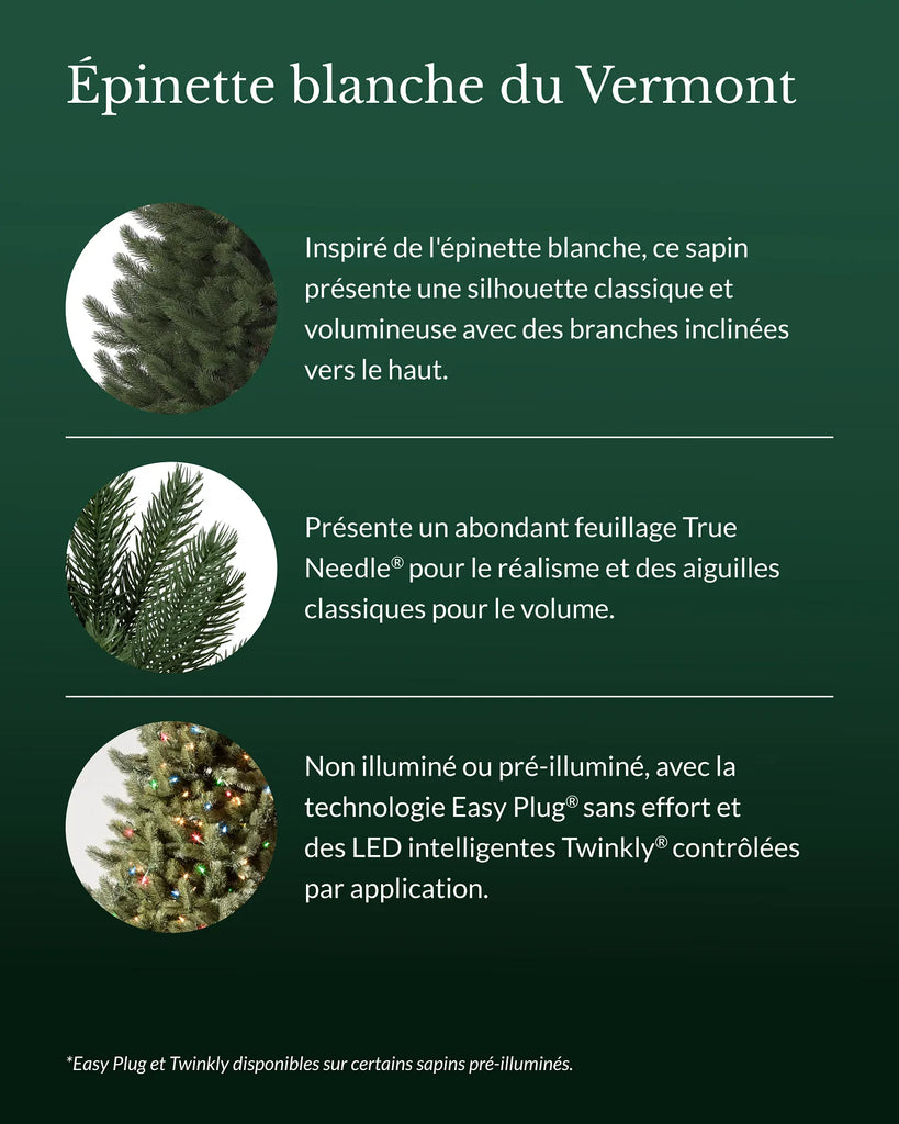 Die Vermont-Weißfichte ist nicht nur unser beliebtester Weihnachtsbaum, sondern auch einer unserer schönsten und innovativsten. Sie bietet die größte Auswahl an Größen, Beleuchtungsoptionen und Formen aller unserer Bäume. Kombinieren Sie sie mit unseren Kränzen und Girlanden aus Vermont-Weißfichte für eine elegante Weihnachtsdekoration.